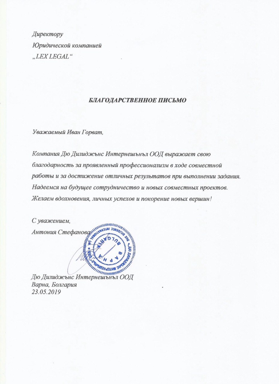 Щиро вдячна Lex Legal за їхню відмінну роботу! З повагою Євгенія