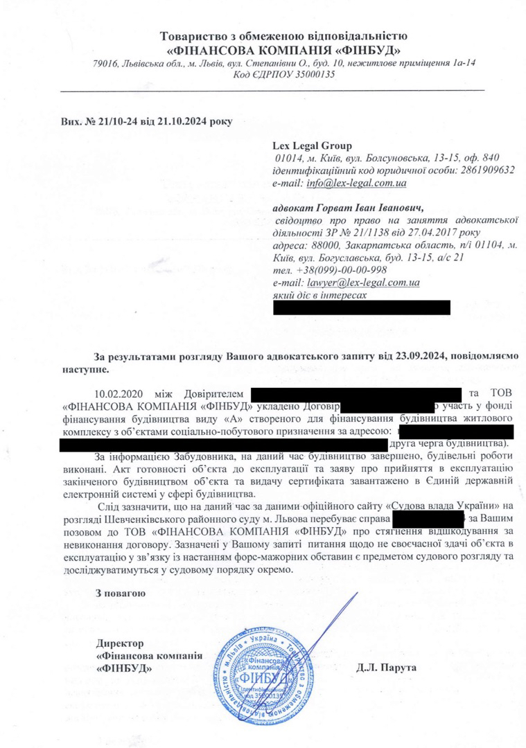 Професійний адвокат розпочав роботу із направлення офіційного листа-претензії та адвокатського запиту до забудовника. Це важливий інструмент, який дозволяє отримати інформацію безпосередньо від сторони, що має правове зобов’язання надати відповідь. На запит було отримано відповідь від забудовника, у якій надано кілька ключових деталей, що прояснюють ситуацію.