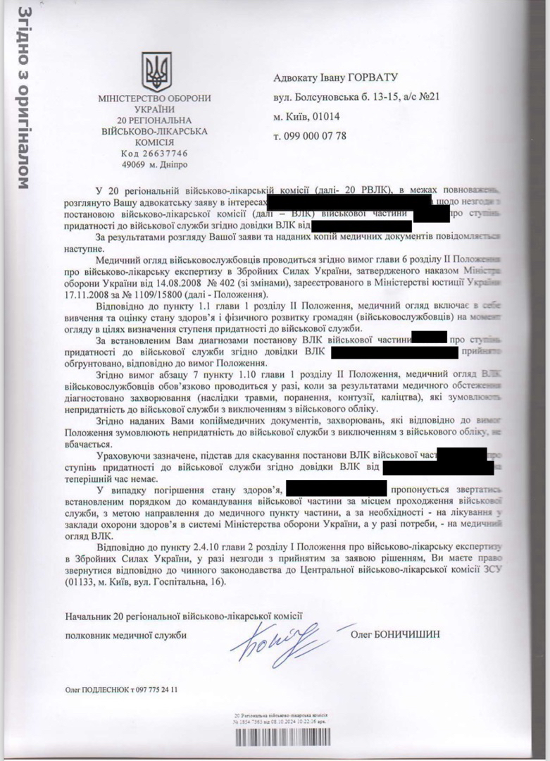 20 РВЛК ретельно розглянула скаргу та надала офіційну відповідь. У документі зазначається, що підстав для скасування рішення попередньої комісії немає, однак при погіршенні стану здоров'я військовослужбовцю рекомендується звертатися до медичних закладів або військової частини для подальшого обстеження. У разі потреби він може бути направлений на повторне медичне обстеження.