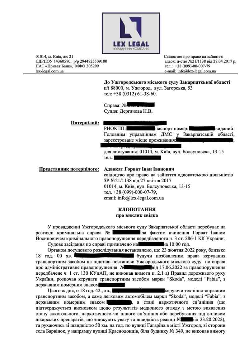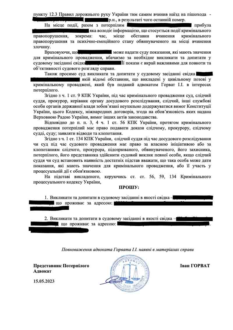 Клопотання про виклик свідків зі сторони потерпілої сторони (сина померлого), які можуть підтвердити ряд обставин ДТП (дорожньо-транспортної пригоди), після того як винуватець не визнає свою вину й відмовляється відшкодувати будь-яку шкоду… наші адвокати йдуть у наступ.