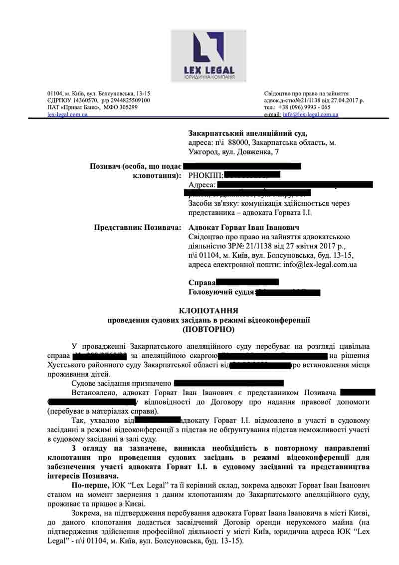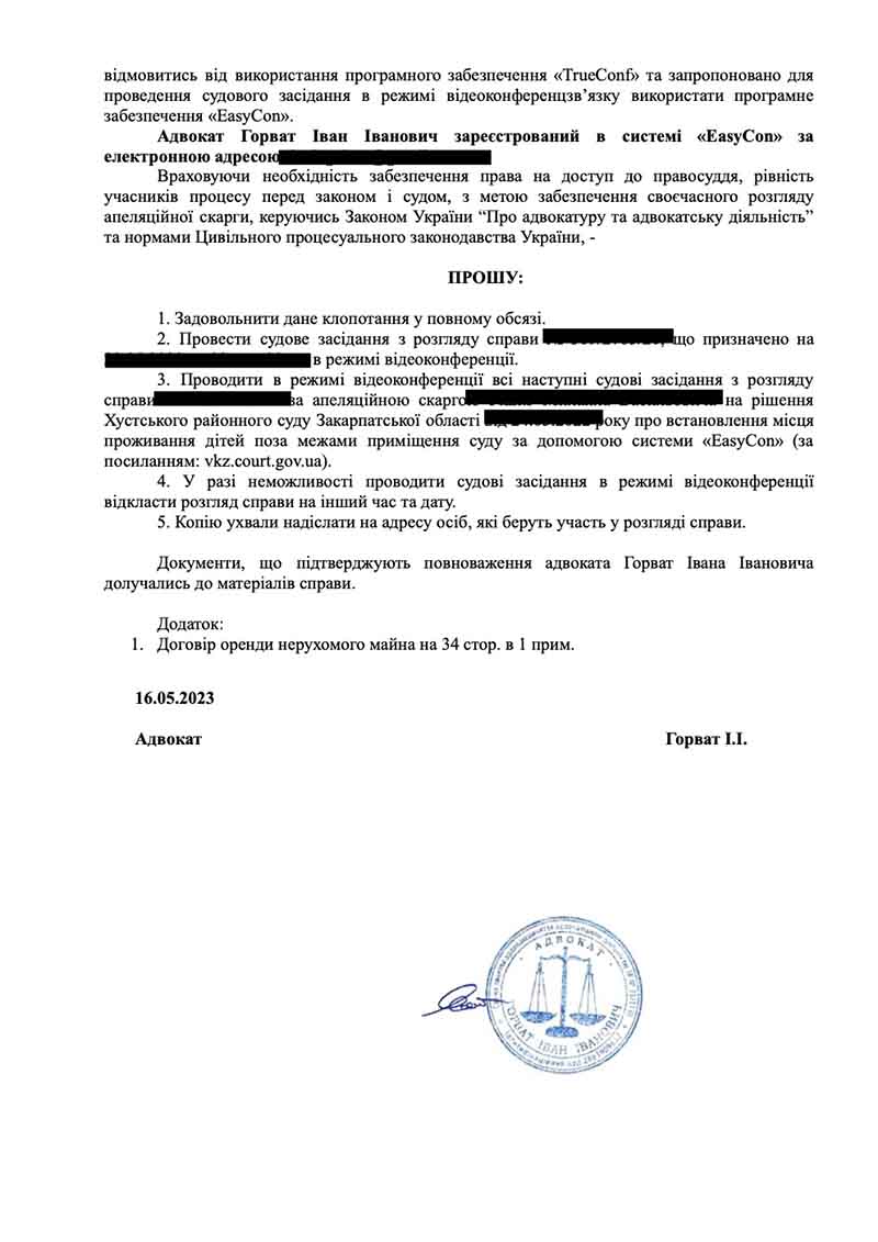 Клопотання до апеляційного суду наших адвокатів, який безпідставно вже одного разу в даній справі відмовив у проведенні судового засідання в режимі відеоконференції, але ми ПОВТОРНО СПРОБУВАЛИ, й у разі відмови буде підготовлена скарга до ДСАУ (держ.судової адміністрації України). Ото ж боріться за свої права, адже така відмова — це пряме порушення конституційного права на захист