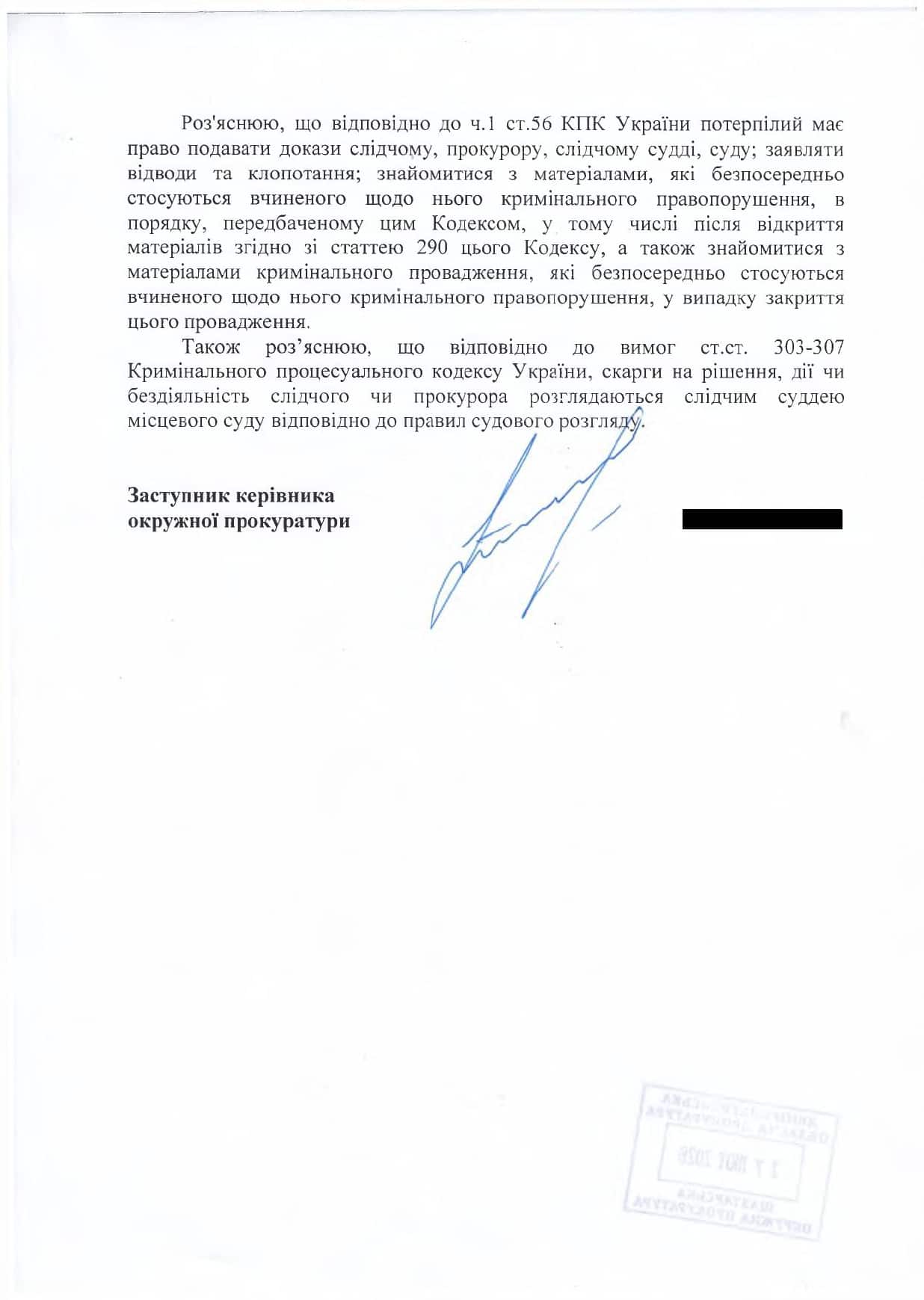 Крім того, у відповіді роз’яснено право потерпілого оскаржувати рішення, дії або бездіяльність слідчого чи прокурора до слідчого судді відповідно до ст. 303–307 КПК України.