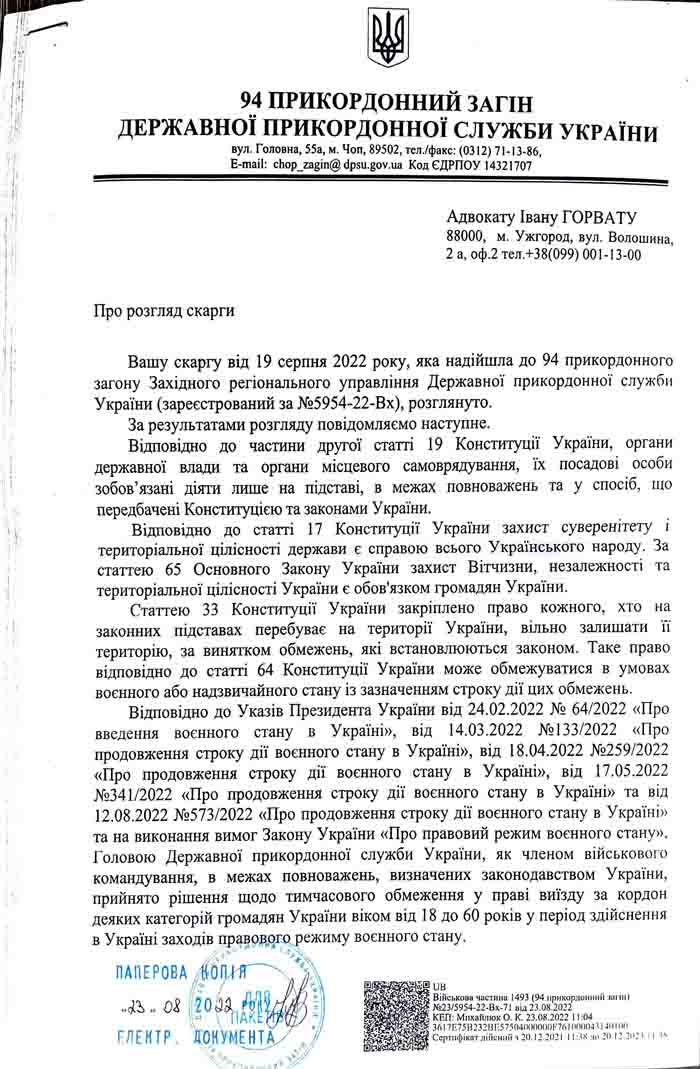 З метою досудового врегулювання спору, адвокатом Горват І.І. направлено відповідну скаргу щодо визнання рішення протиправним та його скасування.