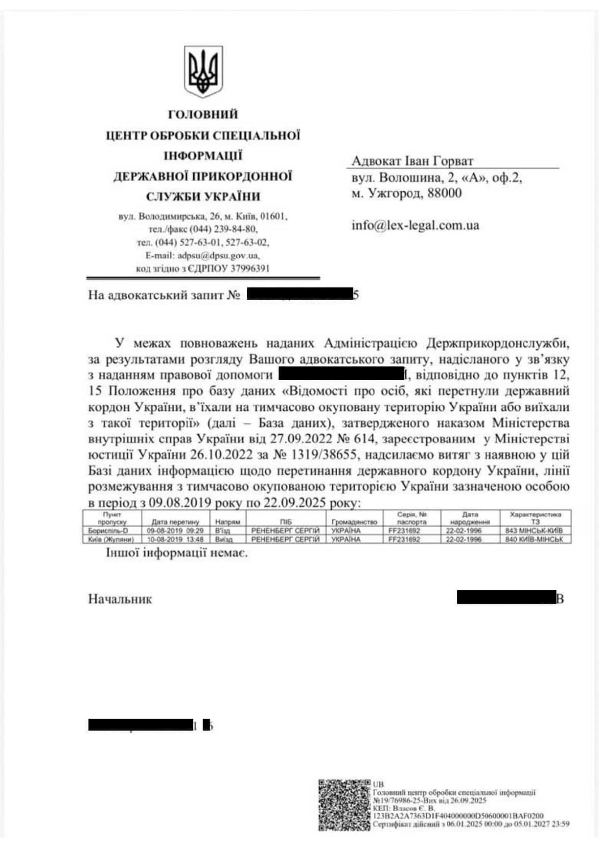 Необхідність звернення за отриманням інформації про перебування особи в країні виникла у нашого клієнта. Знаходячись за кордоном тривалий період, даний громадянин дізнався, що щодо нього накладено штраф через нез’явлення за повісткою до ТЦК та СП. Задля спростування умислу нез’явлення за викликом, а також підтвердження факту неможливості отримання повістки від ТЦК та СП з причини відсутності особи в Україні, наші військові адвокати звернулися до Центру обробки спеціальної інформації Державної прикордонної служби України. У відповідь було отримано підтвердження факту виїзду клієнта з України та його неповернення в країну в зазначений період часу.
