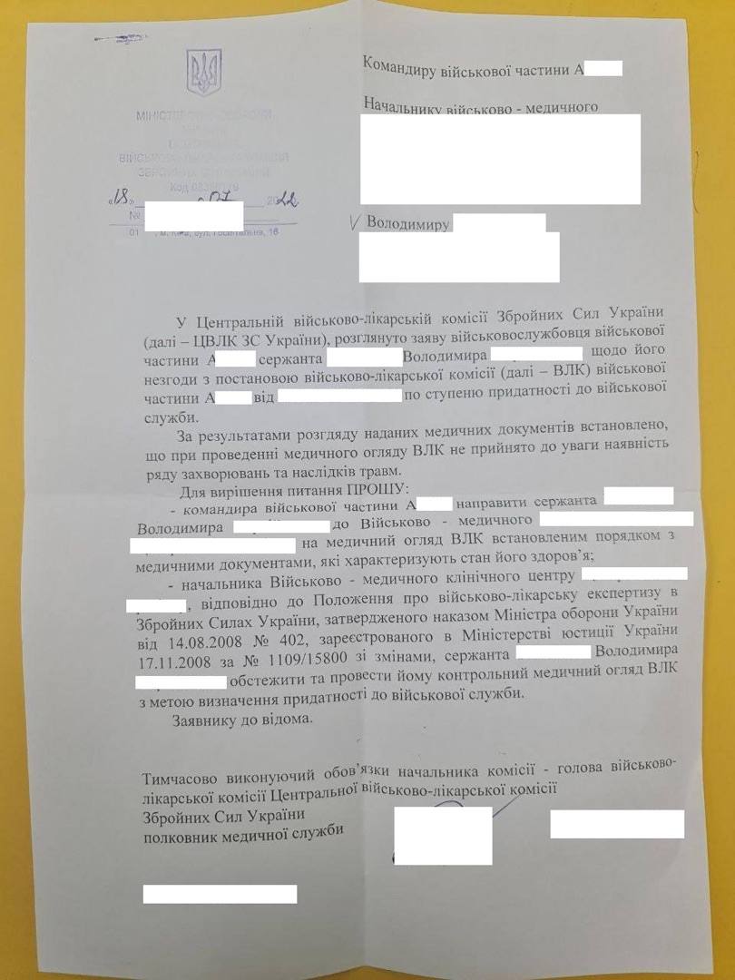 Випадок, коли командир військової частини повторно, за ініціативою нашого юриста, направив клієнта на повторне ВЛК (військово-лікарську комісію). Це сталося через те, що попередні лікарі на попередньому ВЛК не врахували низку медичних документів про реальний стан здоров’я.