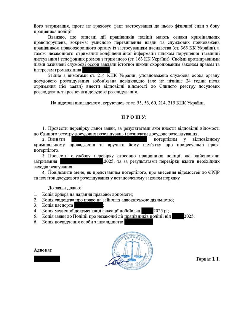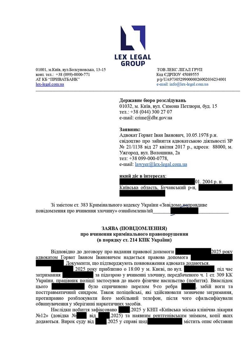 До юридичної компанії звернулася молода людина з проблемою побиття представником правоохоронних органів під час затримання. Участь адвоката була критично важливою для фіксації правопорушення та фіксації наслідків тілесних ушкоджень.