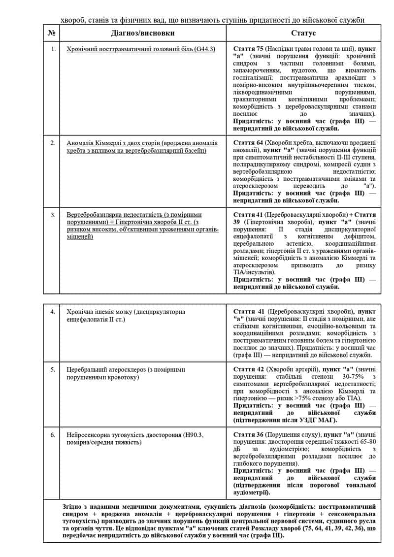 Однак один із ключових діагнозів — хронічний посттравматичний головний біль — чітко підпадає під пункт «а» статті 75 Розкладу хвороб. Це означає значні порушення функцій, що в умовах воєнного часу (графа III) є підставою для визнання непридатним до військової служби з виключенням з військового обліку.