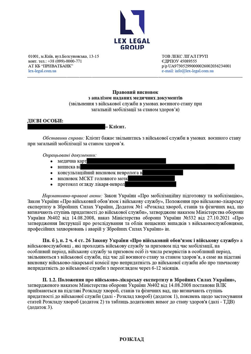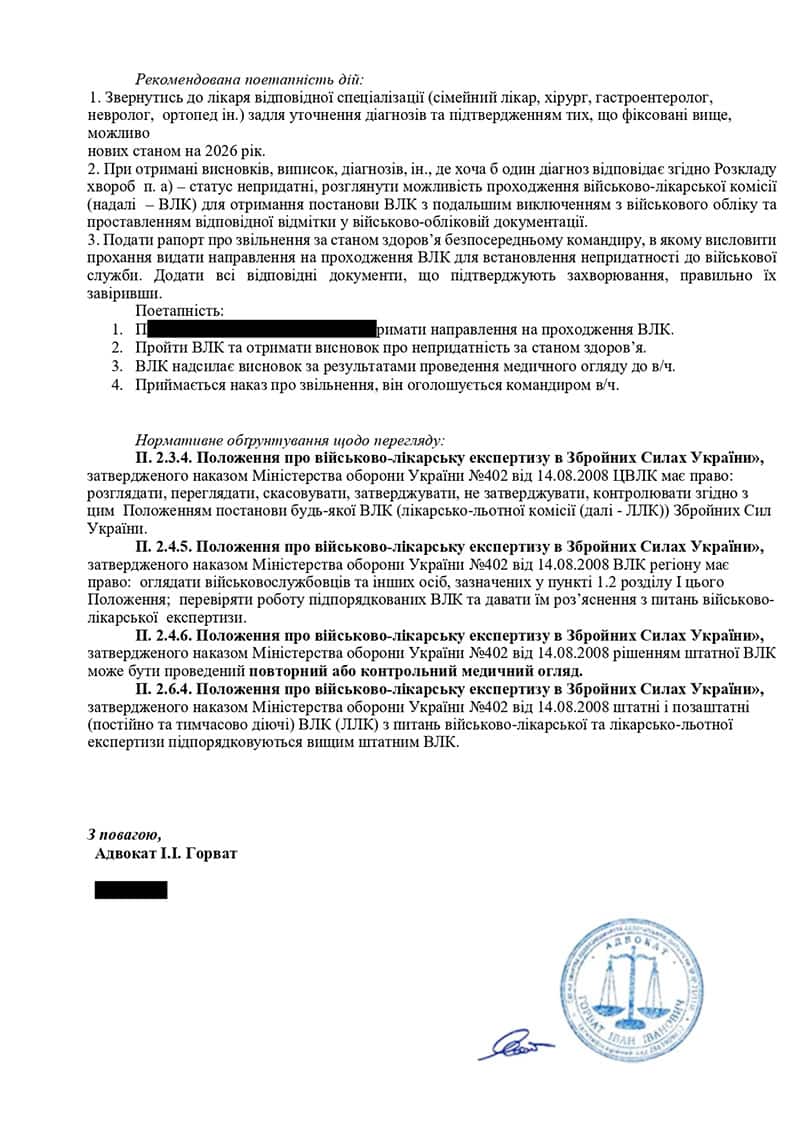 - підготували розгорнутий правовий висновок із посиланнями на ключові норми (Закон «Про військовий обов’язок і військову службу», Положення про ВЛК) та покроковим алгоритмом дій для проходження комісії.