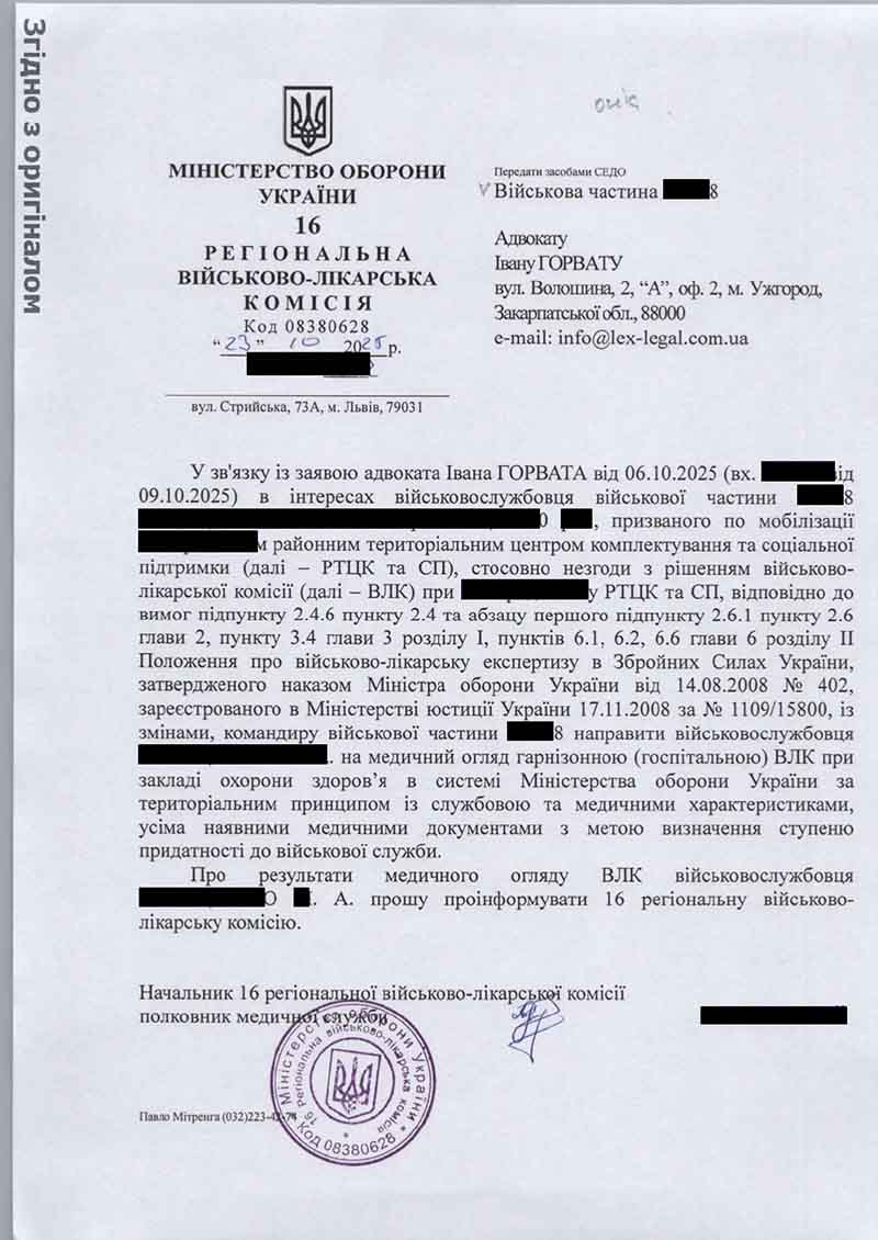 Схожа ситуація склалася й у клієнта нашої юридичної компанії, якого протизаконно доставили на проходження ВЛК при ТЦК та СП, що тривало близько 15 хв. і, як результат, особу признали здоровою та повністю придатною до несення військової служби, що не відповідало дійсності. Вже у навчальному центрі здоров’я мобілізованого значно погіршилося та загострився його психологічний стан. Представник скористався правом оскарження висновку ВЛК до вищої штатної регіональної ВЛК та отримав досягнення цілі – військову частину зобов’язано направити солдата на медичний огляд гарнізонною (госпітальною) ВЛК при закладі охорони здоров’я в системі Міністерства оборони України.
