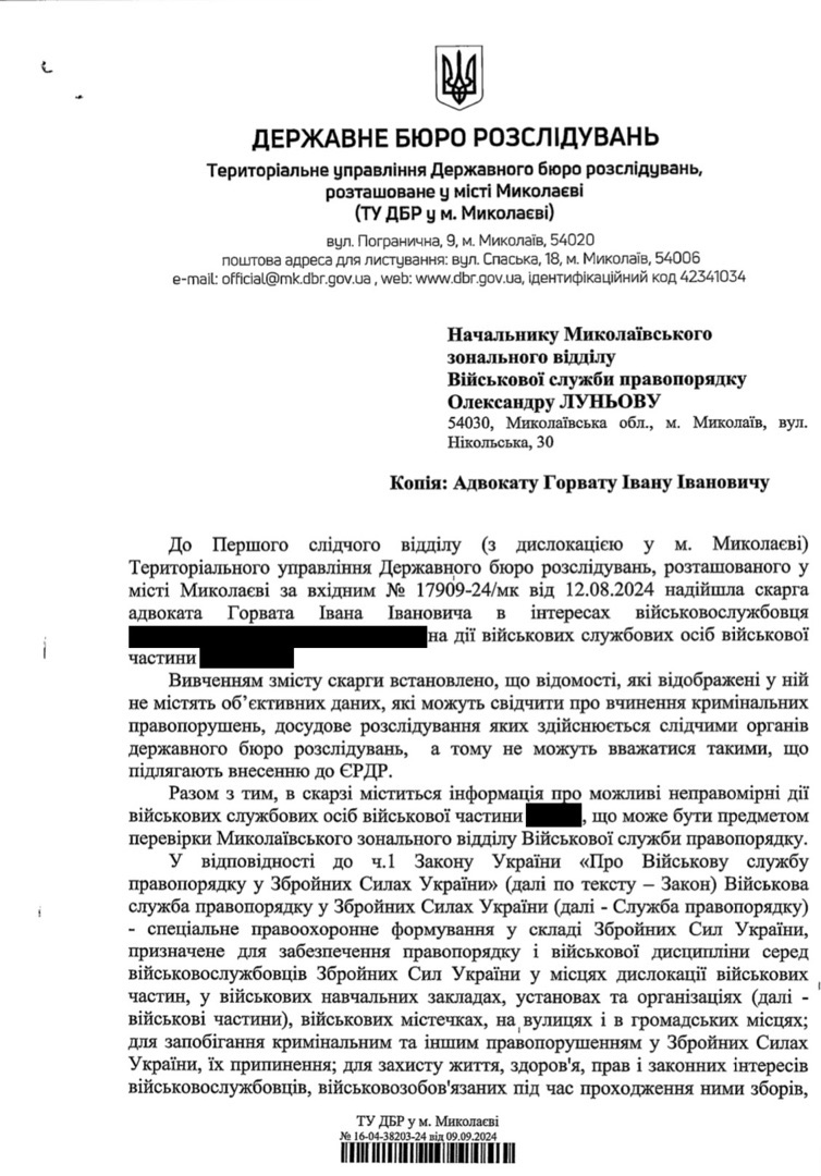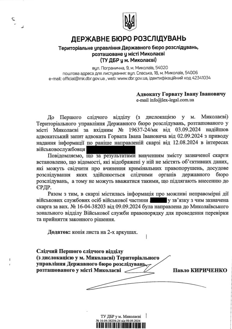 Адвокат подав скаргу до Державного бюро розслідувань (ДБР) на дії командування, яке незаконно відмовилося приймати документи на оформлення статусу УБД. У скарзі адвокат наголосив на незаконних діях командирів і надав усі необхідні докази порушення прав військовослужбовця. ДБР, провівши попереднє вивчення ситуації, відмовило у відкритті кримінального провадження, посилаючись на недостатність підстав для порушення справи. Однак вони ініціювали внутрішню перевірку в частині, що, в свою чергу, призвело до результатів.