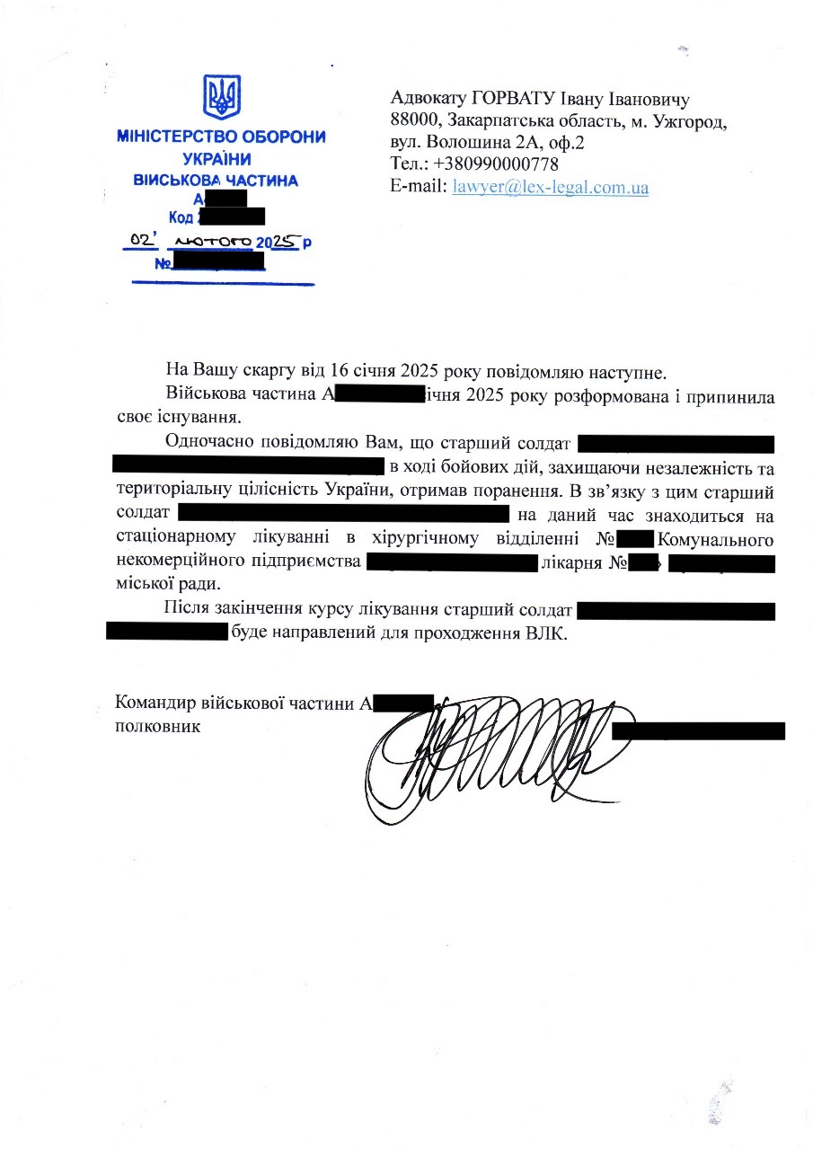 Так до нас звернувся військовослужбовець, який після отриманого поранення та лікування повернувся на службу, однак почав помічати поступове погіршення стану свого здоров’я, що вказувало на необхідність додаткового лікування, медичного обстеження військово-лікарською комісією. У зв’язку з цим він неодноразово звертався до командирів та медиків частини зі скаргами та рапортами, однак останні ігнорувалися, належної відмови чи відповіді отримати не вдавалося. З метою захисту його прав та інтересів, нами було направлено відповідну скаргу на оперативне командування, по якій пізніше надійшла відповідь від командира військової частини. У відповіді, командир зазначив, що військовий отримав поранення, після завершення лікування якого, його буде направлено для проходження військово-лікарської комісії.