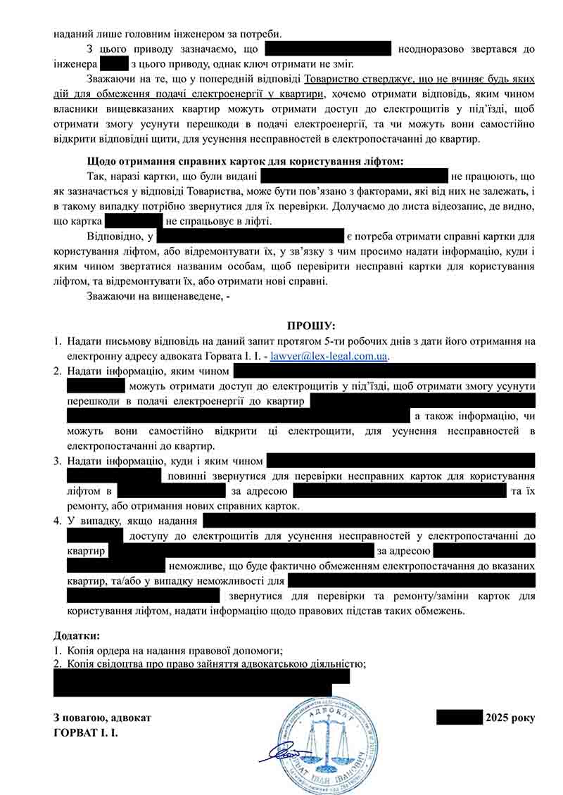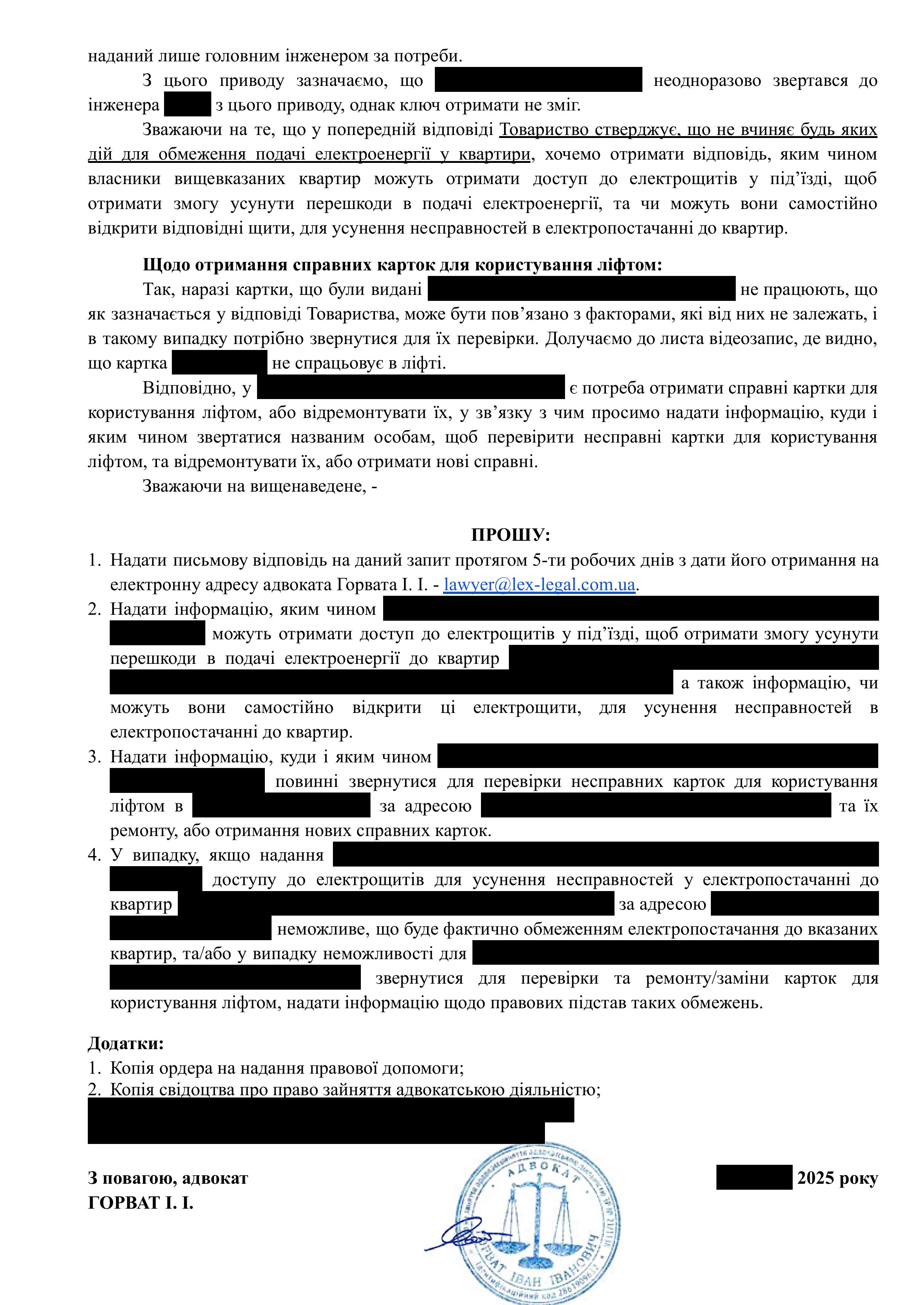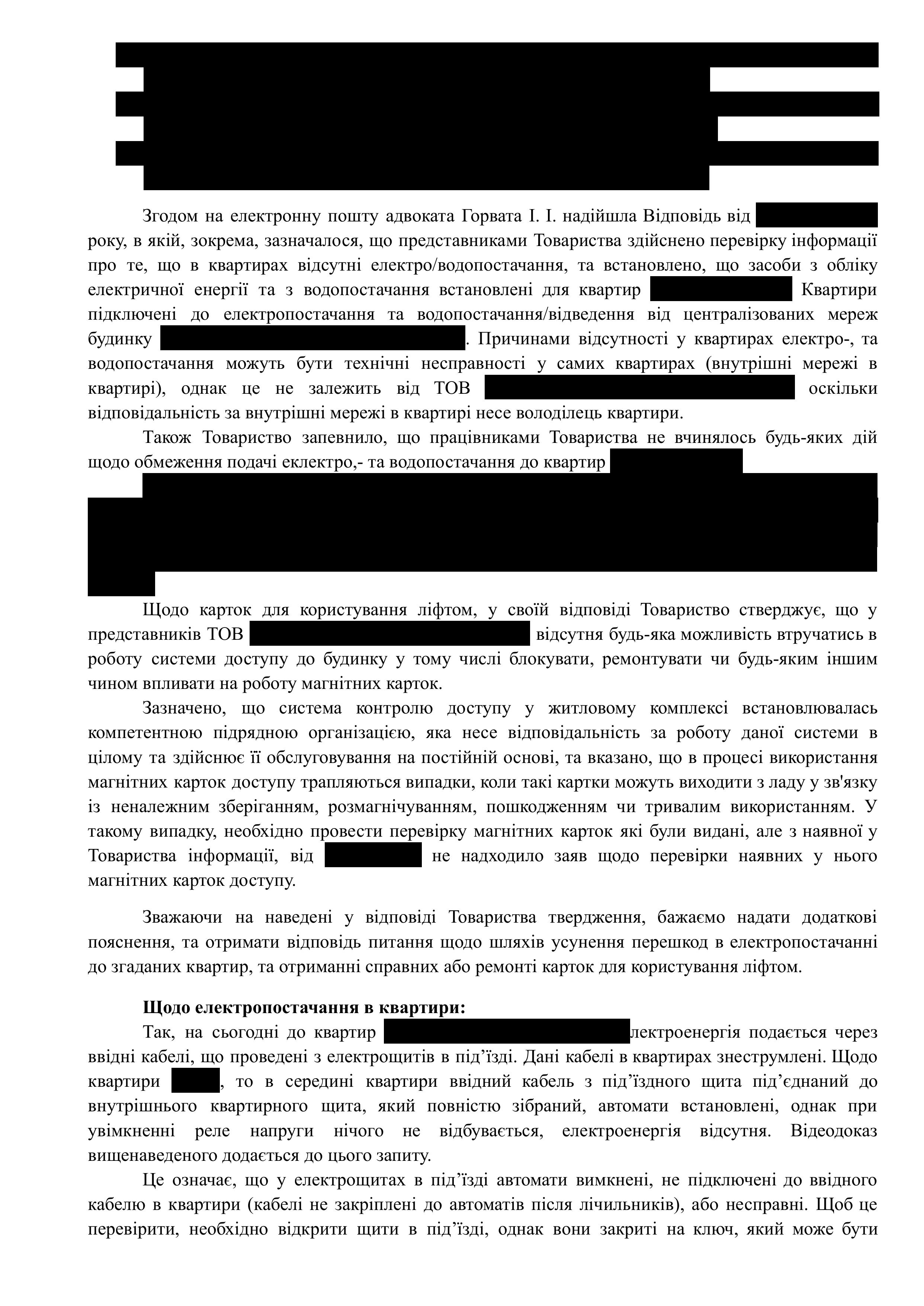 Так, до нас звернувся клієнт, у квартиру якого не постачається електроенергія, по невідомій причині, а встановити її самостійно та усунути неполадки він не міг, бо представники компанії з управління будинком не давали доступ до електрощитів та інших елементів системи електропостачання. У зв’язку з цим, до управляючої компанії було направлено претензію, з відповіді на яку встановлено, що намірів перешкоджати електропостачанню вони не мають, та що зі свого боку перевірили комунікації. Відповідно, у спираючись на цю відповідь нами направлено запит, що містить пропозицію усунення таких перешкод, для погодження подальших кроків з управлінцем.