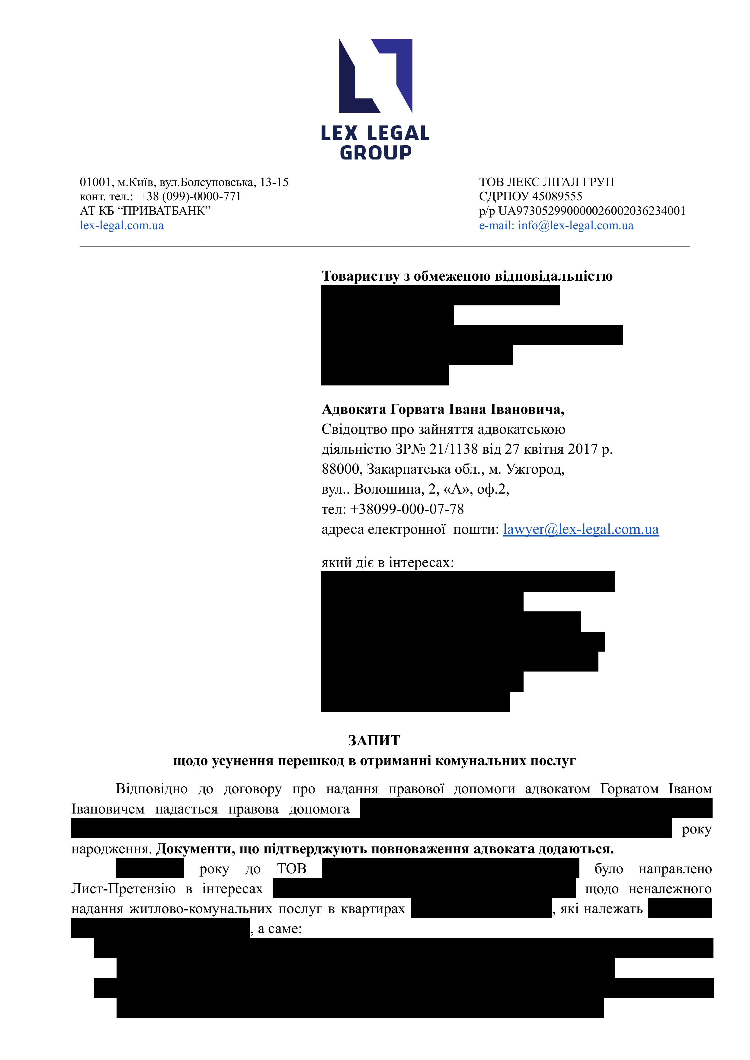 Незважаючи на це, завжди можна встановити комунікацію з такими компаніями шляхом офіційної комунікації через претензії та запити, з письмових відповідей на які можна детальніше з’ясувати обставини ситуації та розробити пропозицію щодо усунення перешкод в наданні комунальних послуг. Зокрема, такими комунікаціями займаються юристи компанії Lex Legal Group, які можуть допомогти вирішити питання навіть за наявності конфлікту чи спору між споживачем та управлінцем.