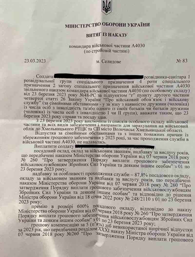 Військовослужбовець, який проходив військову службу та брав участь у найнебезпечніших напрямках і надалі б захищав нашу свободу та спокій, проте наявність сімейних обставин призвела до неможливості надалі нести військову службу.