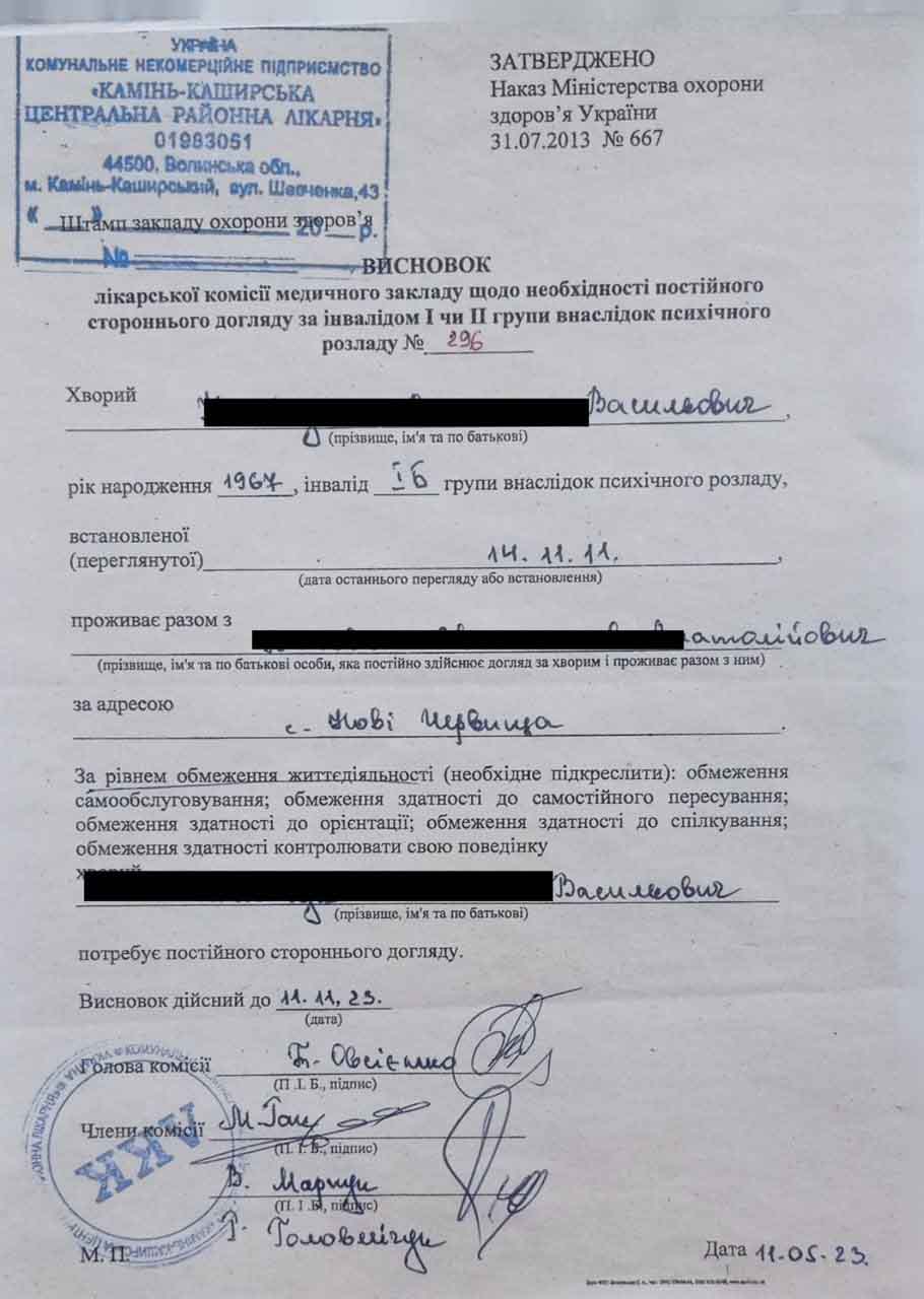 Один з документів, отриманих нашими адвокатами: «Висновок ЛКК» (лікарської консультаційної комісії) про перебування на утриманні особи інваліда 1 гр., що дає право на підставі статті 26 ЗУ «Про мобілізацію та мобілізаційну підготовку» бути звільненим з ЗСУ.