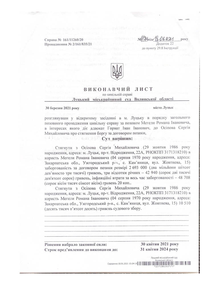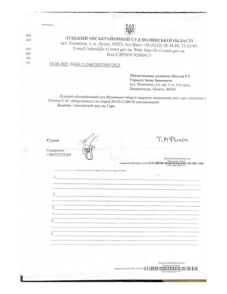 - Була подана заява про стягнення заборгованості та завдяки професійності компанії позов був задоволений заочним рішенням суду