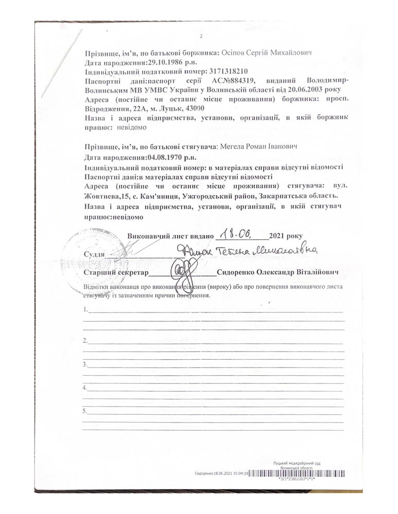 - На підставі вище зазначеного судового рішення суду ми звернулися до суду з заявою про видачу виконавчого листа, і якого у подальшому було отримано