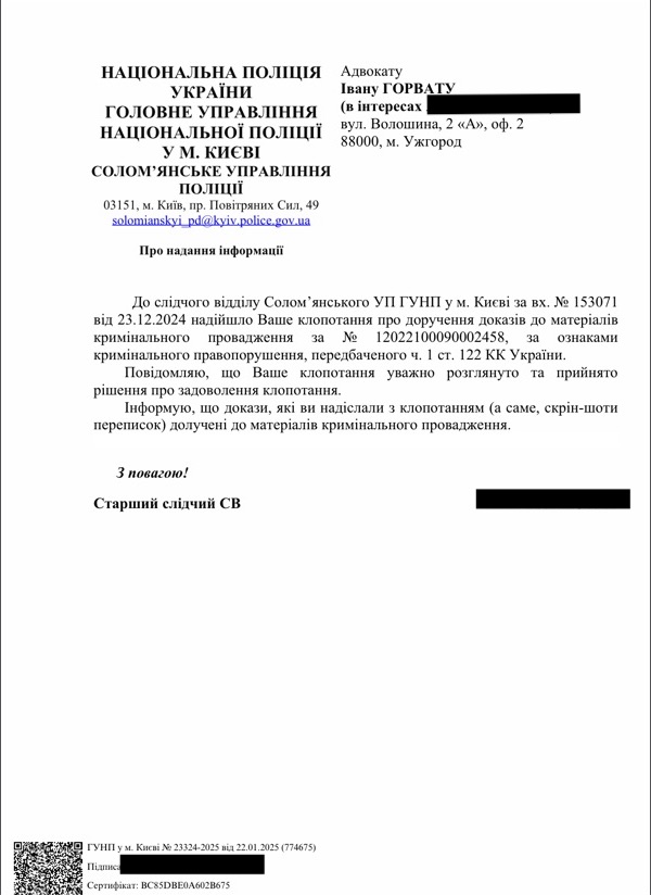 Реакція слідчого не змусила довго чекати: протягом декількох днів нами була отримана відповідь про долучення доказу до матеріалів справи й проведення його перевірки шляхом можливого допиту підозрюваного.